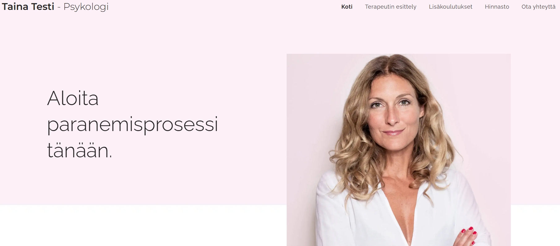 - Kotisivut sisältävät viisi sivua: Koti, Terapeutin esittely, Lisäkoulutukset, Hinnasto, Yhteystiedot